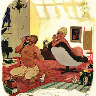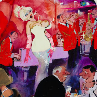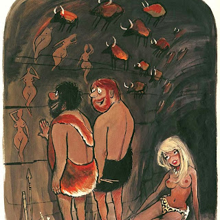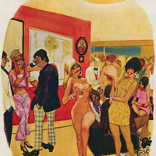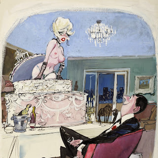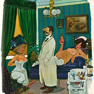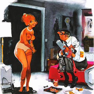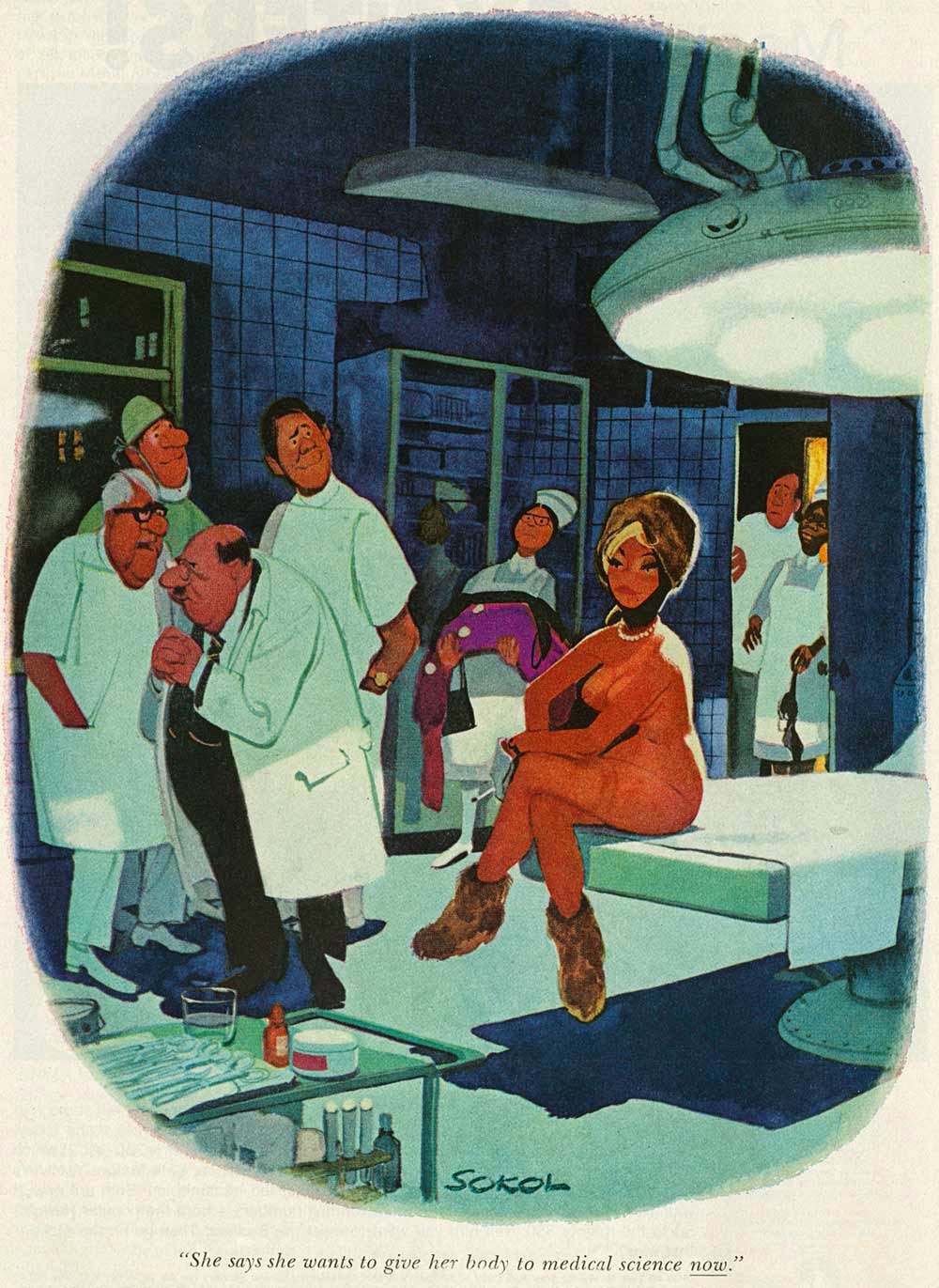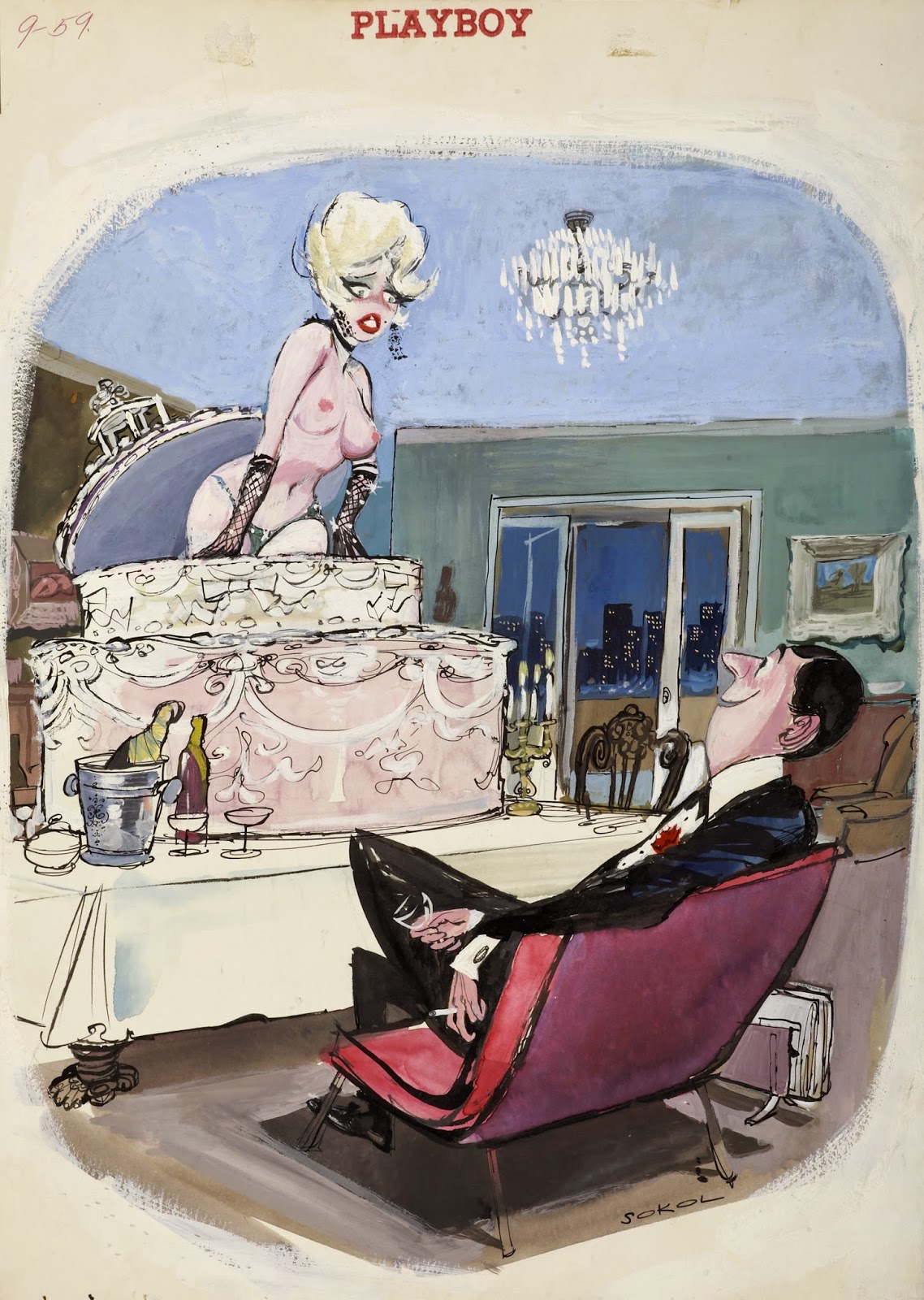 Sokol’s Playboy cartoons were part pin-up cheesecake, part satirical observations on modern life. The women were buxom, provocative and lustful; precisely what appealed to Playboy’s audience of working class men. The women in Erich Sokol’s world were fantasy, but the depictions of where they were found was in grocery stores, a doctor’s office, at a friend’s party, and so on. Occasionally there were women from upper-class society, such as the busty member of royalty at a dinner party whose bosom gets accidentally fondled by a absent-minded table partner.