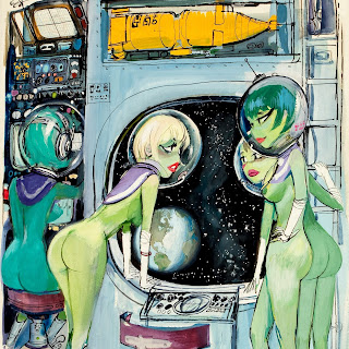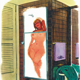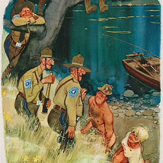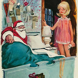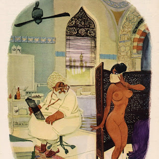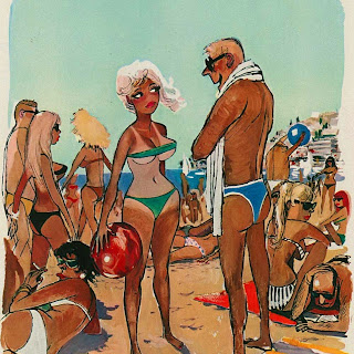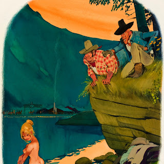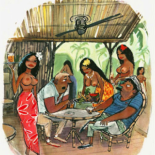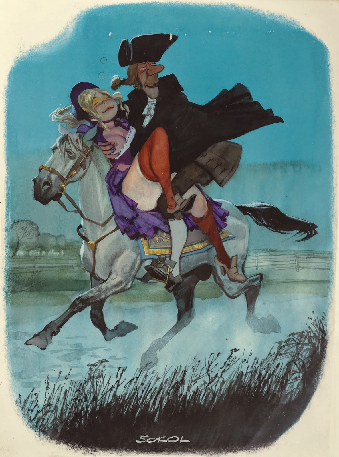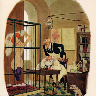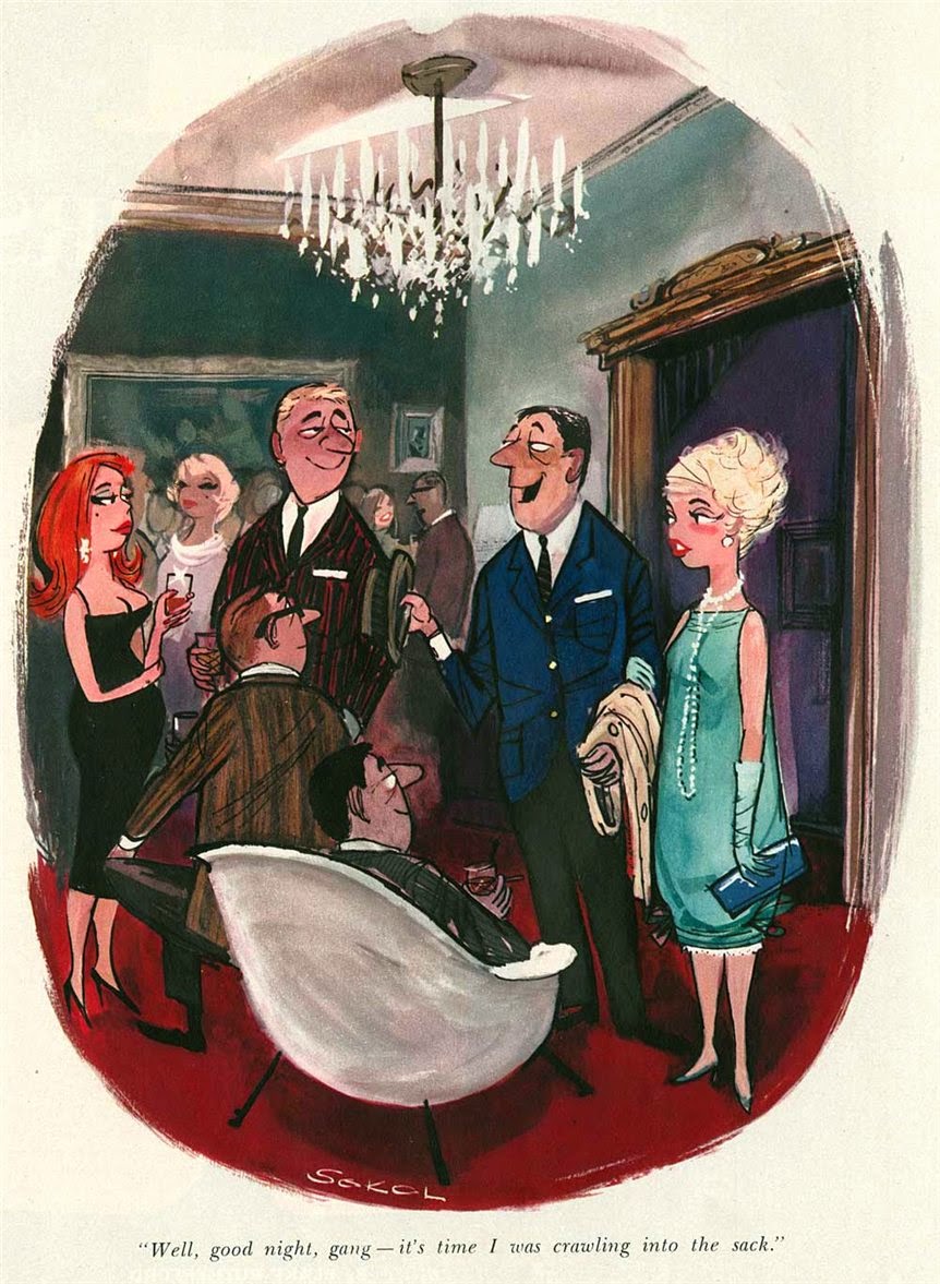 Sokol’s Playboy cartoons were part pin-up cheesecake, part satirical observations on modern life. The women were buxom, provocative and lustful; precisely what appealed to Playboy’s audience of working class men. The women in Erich Sokol’s world were fantasy, but the depictions of where they were found was in grocery stores, a doctor’s office, at a friend’s party, and so on. Occasionally there were women from upper-class society, such as the busty member of royalty at a dinner party whose bosom gets accidentally fondled by a absent-minded table partner.